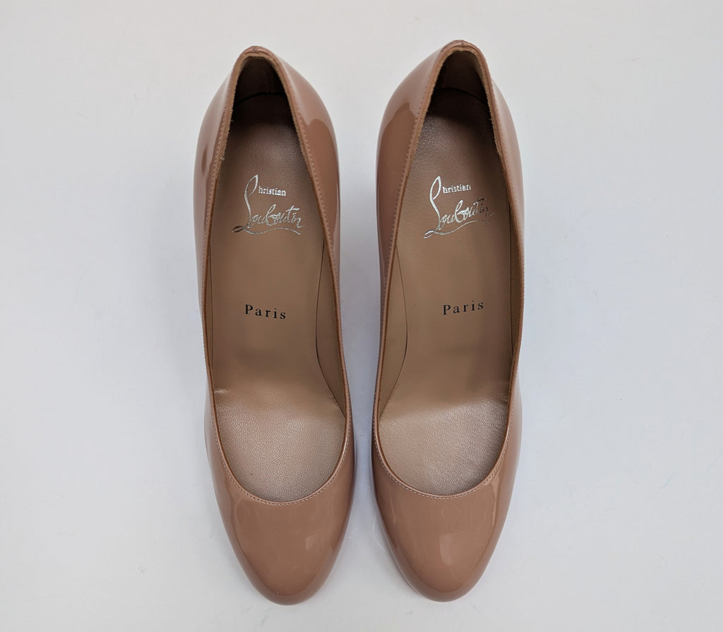 Modern city classic. These Christian Louboutin Pumppie heels come with a flattering almond round toe and low toe vamp for an elongated look, and a 85mm straight heel. Beige warm nude patent leather finish. New in Christian Louboutin box with dust bag and heel tips. Email us for copy of original receipt.