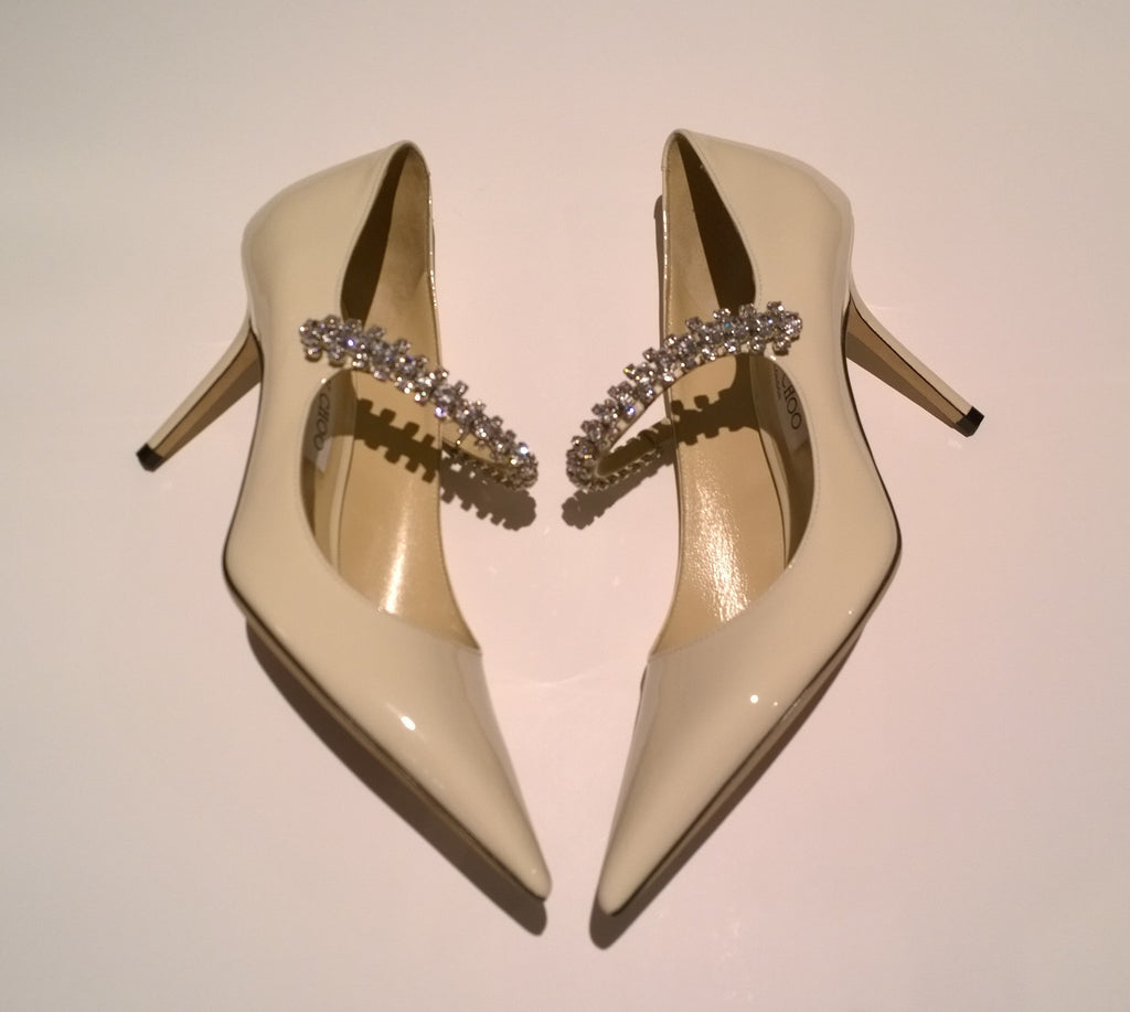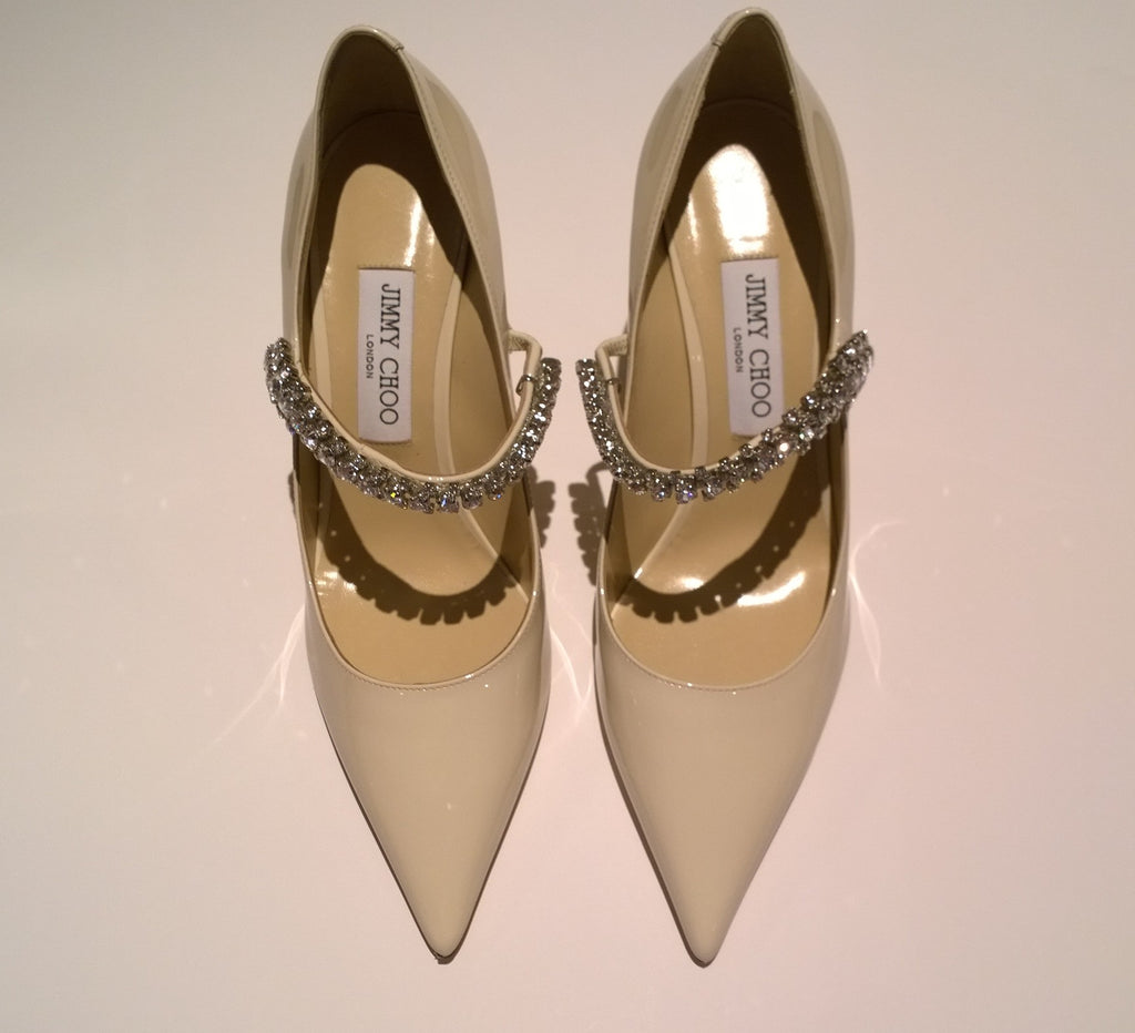 • Jimmy Choo Bing heels come with a silver-backed clear rhinestone strap across the arch. Warm cream patent leather with 65mm heels. Light leather lining with leather soles. The shoes come in original shoe box with dust bag and tags shown. Color code: Linen