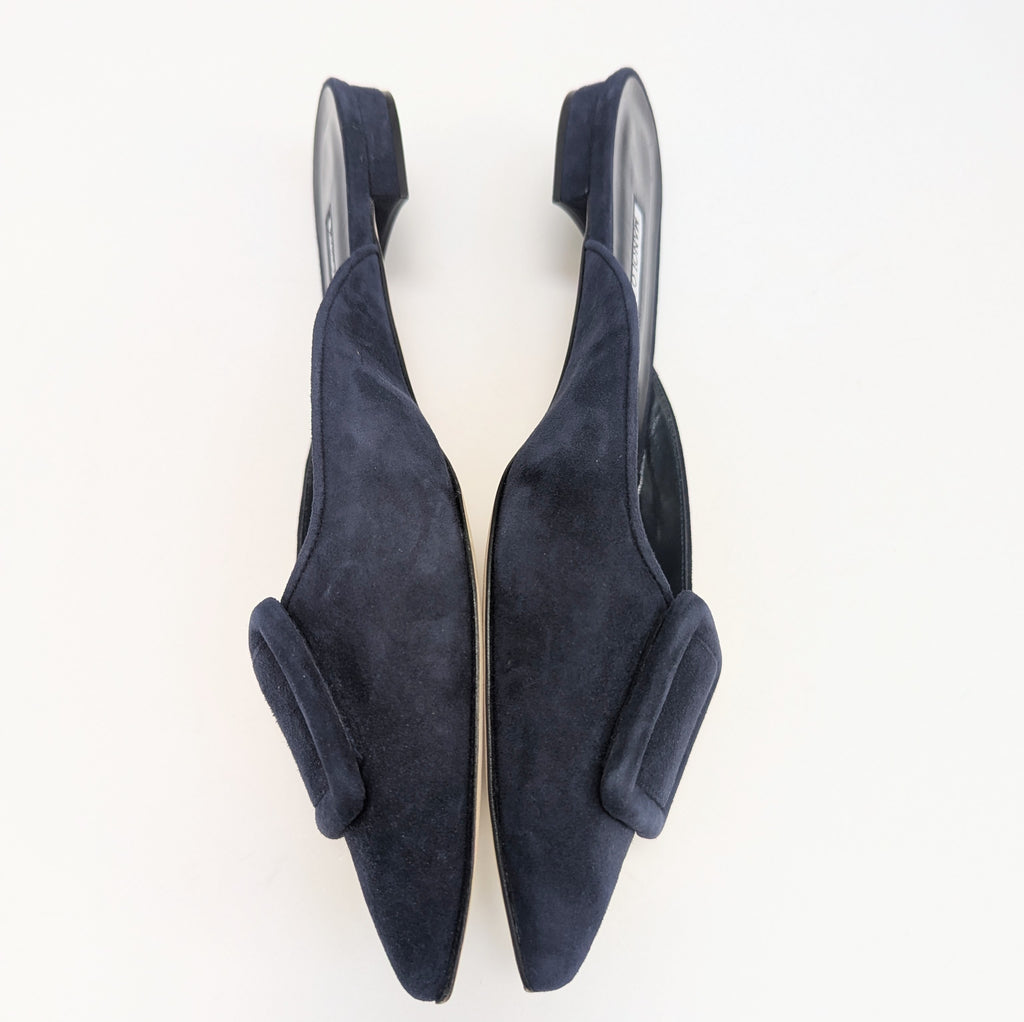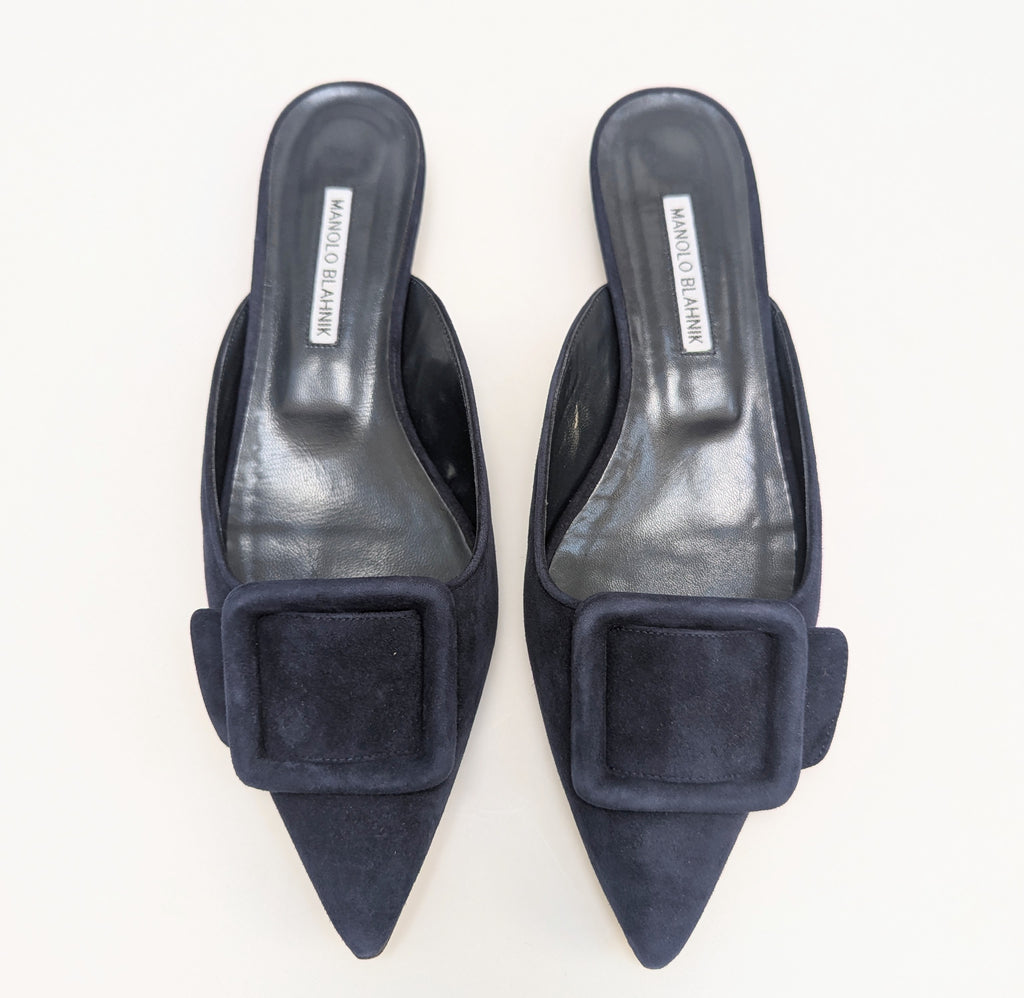 Manolo Blahnik's Maysale mules are chic and sleek, a simple slip on style with great style. Navy blue suede goes with lighter color trousers and skirts as well as browns, greys and burgundys. New in Box.