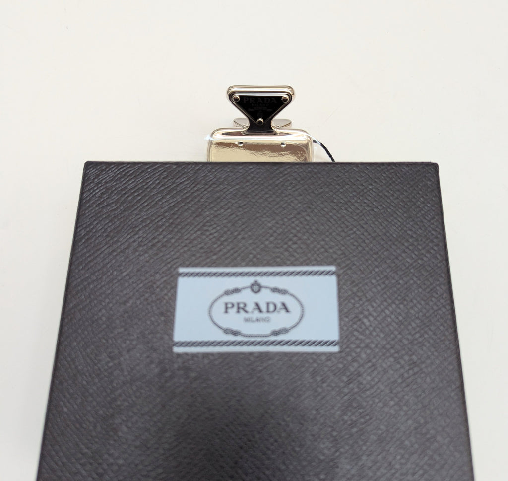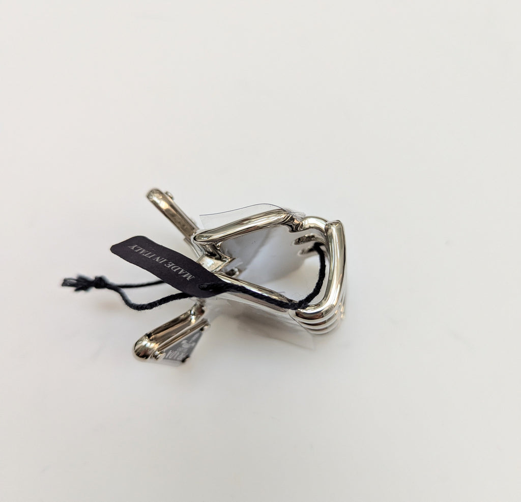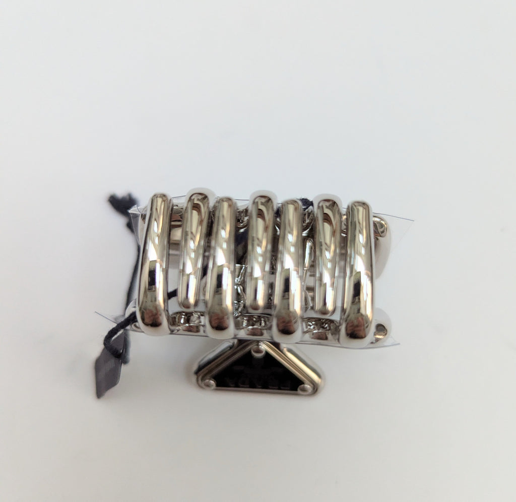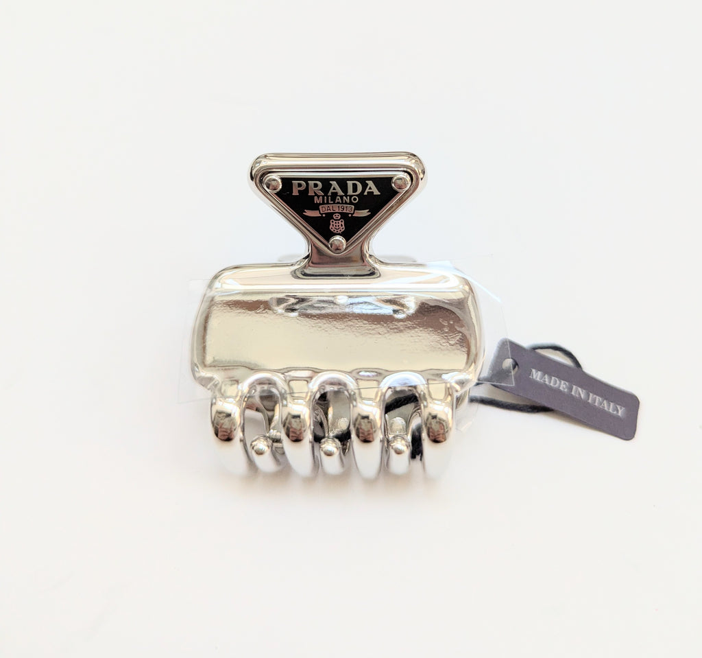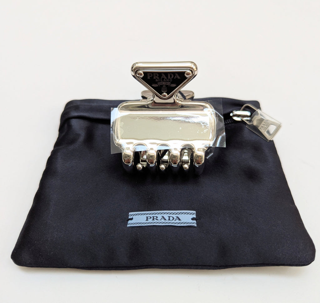 Prada's well known logo decorates this simple claw clip. Made in high polish silver-tone metal, this small clips accentuates your hairstyle. Black enamel Prada logo. The hair clip has a spring mechanism. The clip comes in Prada box with a satin zipper pouch and cards shown.