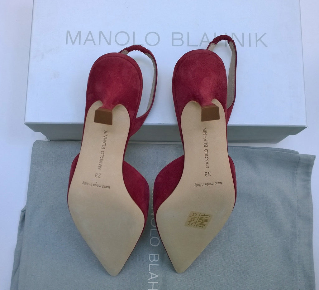 One of Manolo Blahnik's classics, the Carolyne features a gentle pointy toe with a curved front and an elegant slingback on 50mm covered heel. This version comes in dark red suede. The shoes come in original shoe box with dust bag. New in Box.