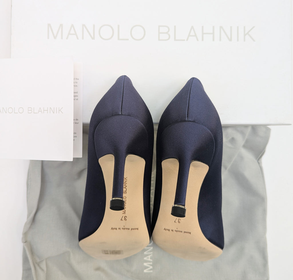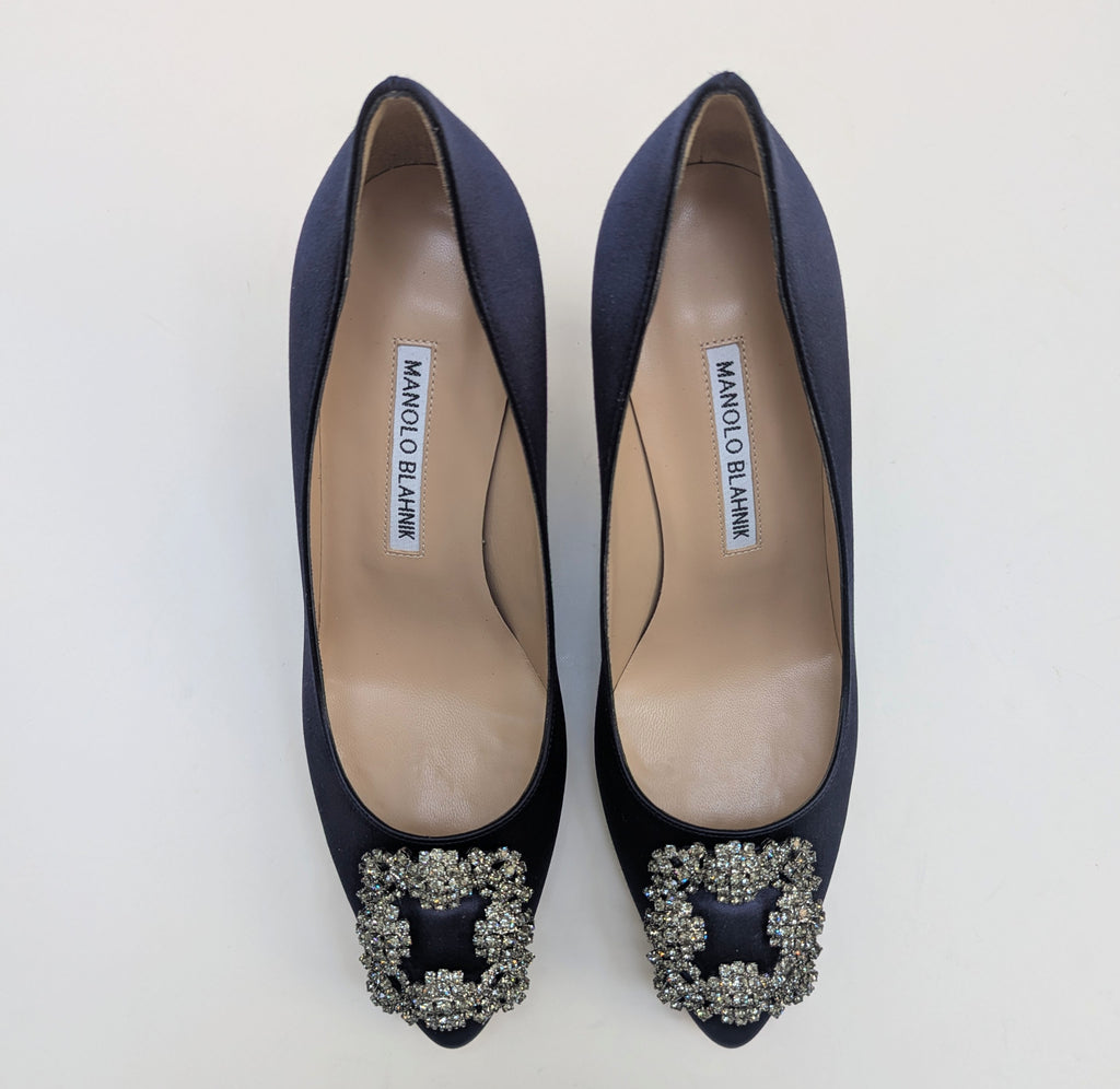 Manolo Blahnik's hangisi heels come in 70mm heels in navy satin, with beige leather inner to hold the shape and heep the feet clean. The front of the shoes are decorated with dark crystals buckle with silver backing. The shoes come in original shoe box with dust bag. Made in Italy. Color code: Navy. Original receipt upon request.
