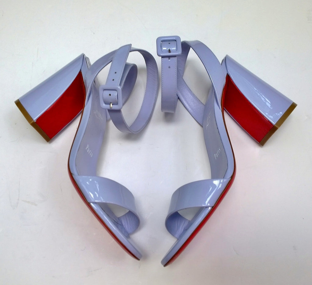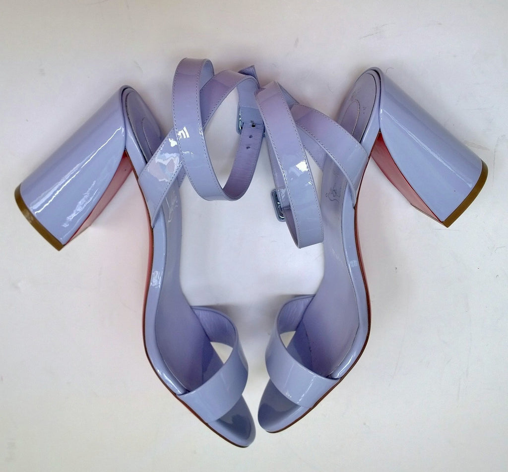 Christian Louboutin Miss Sabina sandals come with a clean design of two thicker bands, one across the toes for comfort and one high around the ankles. Adjustable ankle buckle. Cut in style heel makes these 85mm block heels extra interesting. New in box with dust bag and NO heel tips. Light lavender patent leather. A wonderful option for garden parties, prom and lawn weddings.